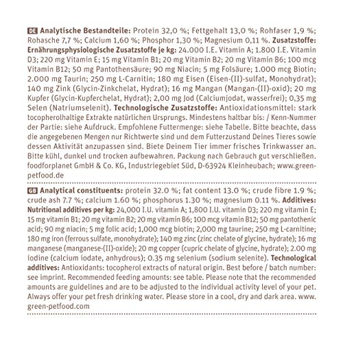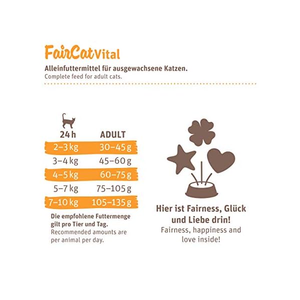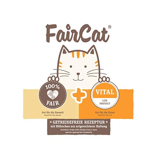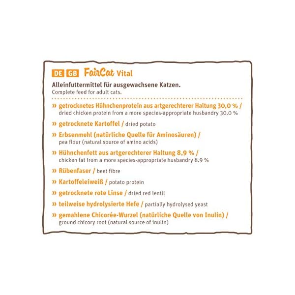 Unser FairCat Vital versorgt Deine Samtpfote optimal mit allen Nährstoffen, um putzmunter durch alle 7 Leben zu kommen. Dabei unterstützt unser einzigartiges Life Protect-Wirkstoffpaket mit wertvollen Antioxidantien, prebiotischem Inulin und wichtigem Taurin die Fitness und das Wohlbefindens Deines ausgewachsenen Tigers. Mit der getreidefreien Rezeptur tust Du aber nicht nur Deiner Katze etwas Gutes, sondern machst auch die Welt jeden Tag nachhaltiger: Denn unser faires Menü ist sogar klimapositiv und enthält ausschließlich tierisches Protein aus artgerechterer Haltung! Zusammensetzung: Getrocknetes Hühnchenprotein aus artgerechterer Haltung 30,0 %; getrocknete Kartoffel; Erbsenmehl (natürliche Quelle für Aminosäuren); Hühnchenfett aus artgerechterer Haltung 8,9%; Rübenfaser; Kartoffeleiweiß; getrocknete rote Linse; teilweise hydrolysierte Hefe; gemahlene Chicorée-Wurzel (natürliche Quelle von Inulin).