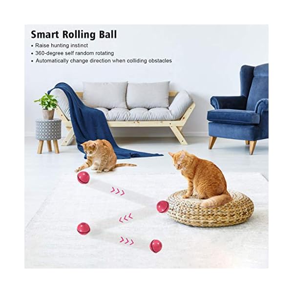【360 Grad Selbstdrehend und Richtung automatisch ändern】: Elektrischer Katzenspielball kann unregelmäßig rollen und die Richtung von selbst wechseln, wenn es auf der Hindernisse wie Wände,Türen,Stühle stößt.