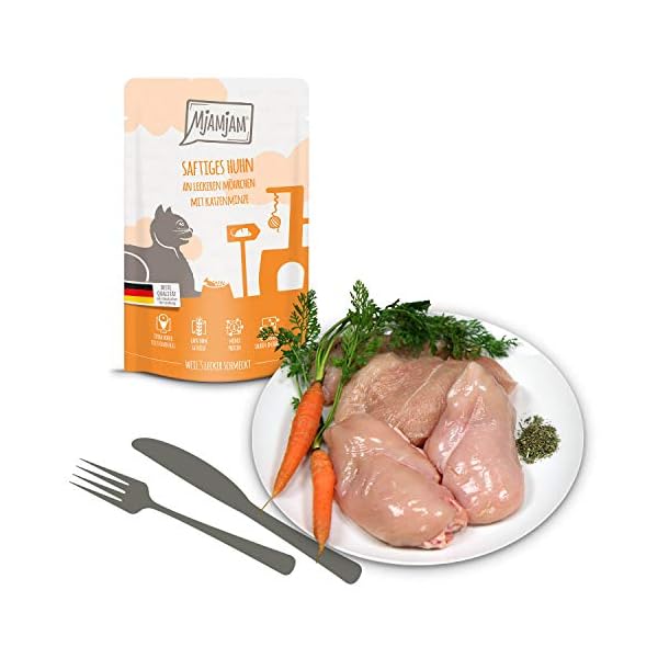 MjAMjAM – Katzenfutter – leckere Mahlzeit mit saftigem Hühnchenfleisch, serviert an knackigen Möhrchen, verfeinert mit einem Hauch von Katzenminze Diese Mahlzeit bietet deinem Liebling alles was er braucht. Das frische Fleisch, verfeinert mit knackigen und gesunden Zutaten, gibt ihm ein einzigartiges und exklusives Genusserlebnis, das ihn zugleich mit allen wichtigen Vitaminen und Mineralien versorgt. MjAMjAM – leckere Mahlzeiten für deinen Liebling: Artgerecht, Natur- und Beutenah. Zusammensetzung: 93,9 % Fleisch und Innereien (93, 9 % Hühnchenfleisch, -leber, -herzen), 5 Möhrchen, 1 % Mineralstoffe, 0,1 % Katzenminze Analytische Bestandteile: Rohprotein: 12,0 %, Fettgehalt: 6,0 %, Rohasche: 1,8 %, Rohfaser: 0,4 %, Feuchtigkeit 78,0 %, Calcium 0,30 % Phosphor 0,25 %, Kalium 0,15 %, Natrium 0,12 % Vitamine & Mineralstoffe: Ernährungsphysiologische Zusatzstoffe je kg: Vitamin D3: 200 IE Vitamin E: 20,0 mg Taurin: 1500 mg Jod als Calciumjodat, wasserfrei: 0,2 mg Mangan als Mangan-(II)-Sulfat: 2,0 mg Zink als Zinksulfat, Monohydrat: 20,0 mg Fütterungsempfehlung: 200-400 g täglich für eine ausgewachsene Katze mit ca. 3-5 kg Gewicht. Frisches Trinkwasser sollte immer zur freien Verfügung stehen. Nach dem Öffnen max. 24 Stunden im Kühlschrank aufbewahren. Bitte zimmerwarm füttern. Warum MjAMjAM füttern? Bei uns steht das Tierwohl an erster Stelle. Unser wichtigster Lieferant, die Natur, liefert uns alle Bestandteile um unserer Philosophie und dem Bedarf Ihres Lieblings gerecht zu werden. Was dem Tier wohl tut? Eine ausgewogene Ernährung, die einer natürlichen Beute sehr nahe ist. Dieses Prinzip leben wir in unserer täglichen Arbeit. Unsere Philosophie? „Artgerecht, Natur- und Beutenah“ dies steht bei uns für einen sehr hohen Fleischanteil, verfeinert mit knackigen Zutaten wie Obst oder Gemüse – die wichtigsten Nährstofflieferanten für Ihren Liebling.