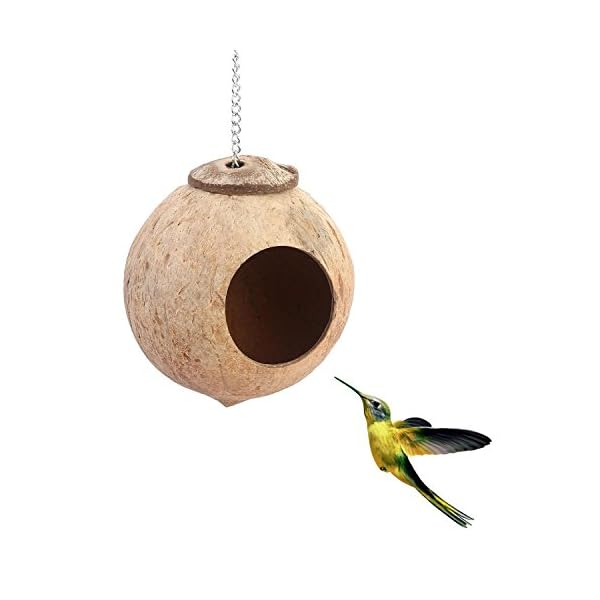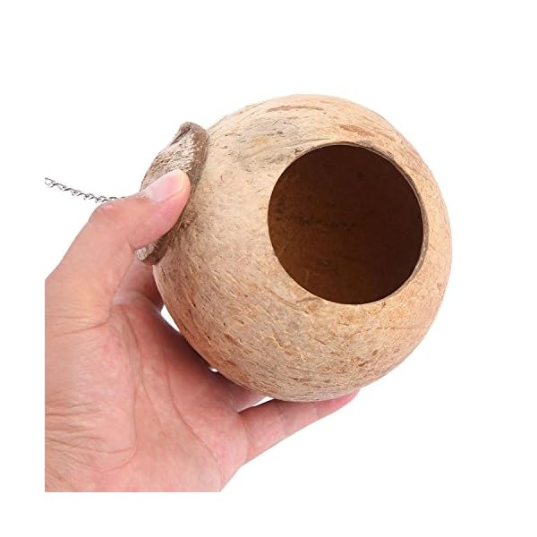 Die Vogelhäuser verfügen über eine Öffnung von 6 cm Durchmesser, die Kokosnuss-Schale hat einen Durchmesser von etwa 13 cm.