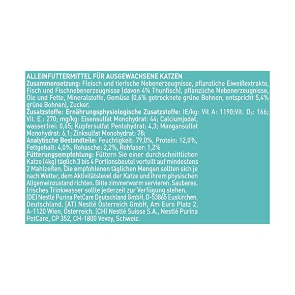 » Zusammensetzung: Fleisch und tierische Nebenerzeugnisse, pflanzliche Eiweißextrakte, Fisch und Fischnebenerzeugnisse (davon 4% Thunfisch), pflanzliche Nebenerzeugnisse, Öle und Fette, Mineralstoffe, Gemüse (0,6% getrocknete grüne Bohnen, entspricht 5,4% grüne Bohnen), Zucker