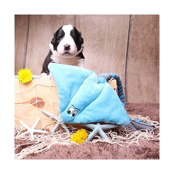 Rochen (Blau-Grau) Hunde spielzeug ist aus weichem und feinem Plüsch gefertigt. Der mittlere Teil des Stachelrochens (der Körper) ist mit Hohlfaser gefüllt. Für eine bessere Haltbarkeit besteht das Spielzeug aus zwei Schichten Stoff. Der Schwanz ist in Fleece verwickelt und am Körper fest angenäht, was ideal zum Tauziehen ist.
